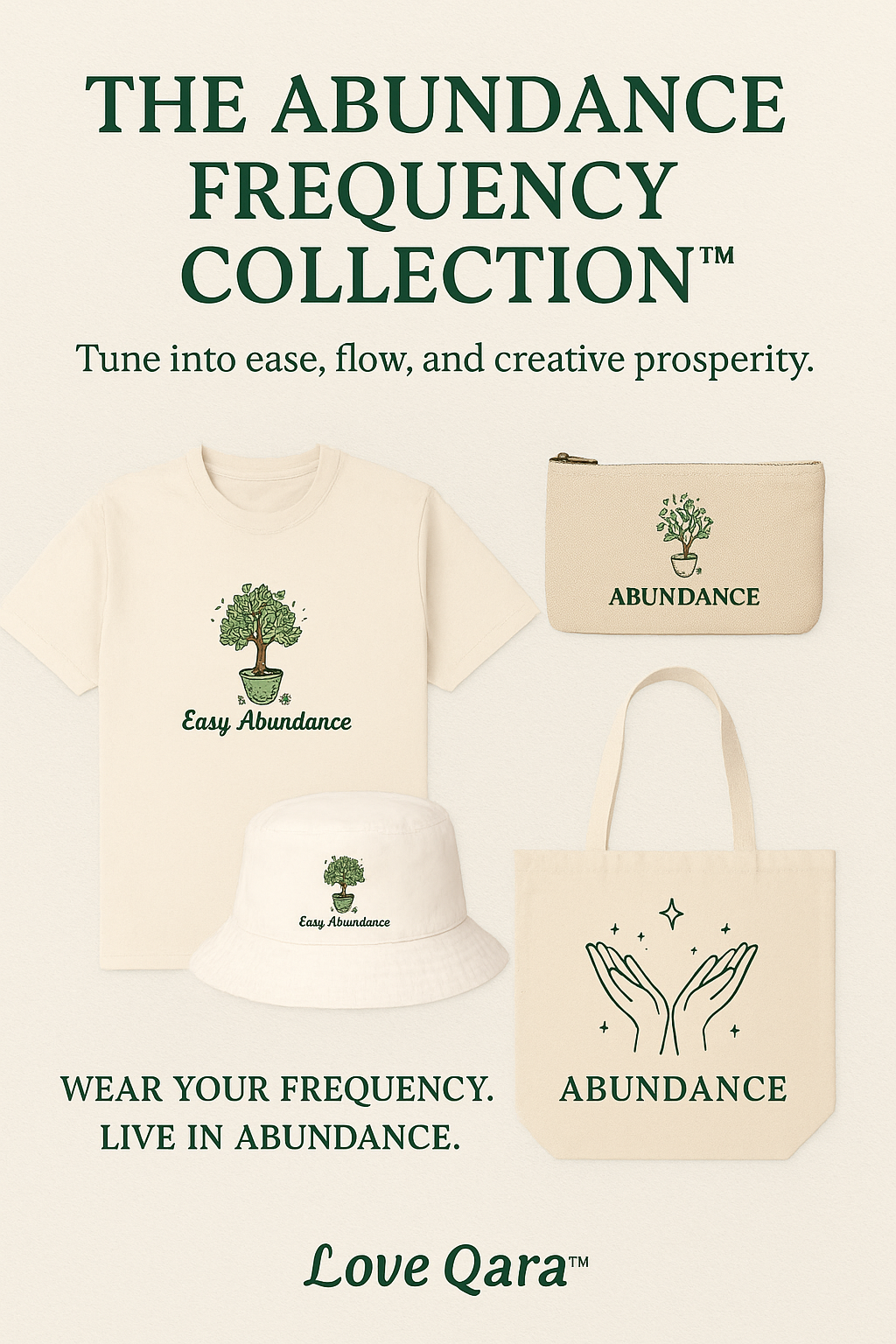 Step into alignment with The Abundance Frequency Collection™, a curated mix of apparel and accessories designed to attract ease, prosperity, and flow. Each piece carries a mindful message of gratitude, grounded wealth, and spiritual well-being — reminders that abundance isn’t chased, it’s cultivated.